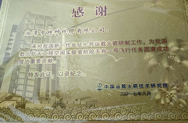 2011年9月29日,“神猴電纜”助力“天宮一號(hào)”,用長(zhǎng)征二號(hào)F火箭將“天宮一號(hào)”目標(biāo)器發(fā)射升空,同年,受到了中國(guó)載人航天工程辦公室的表彰